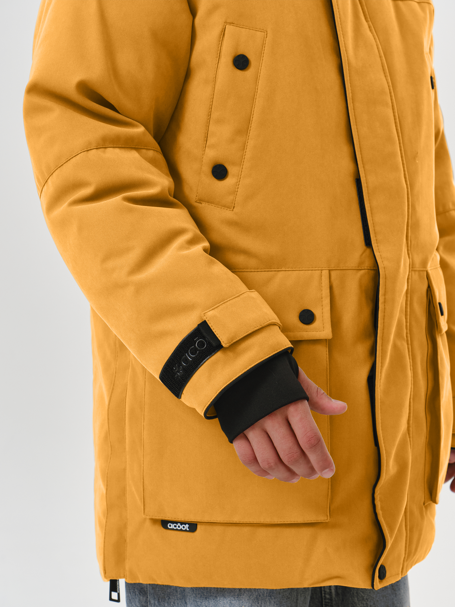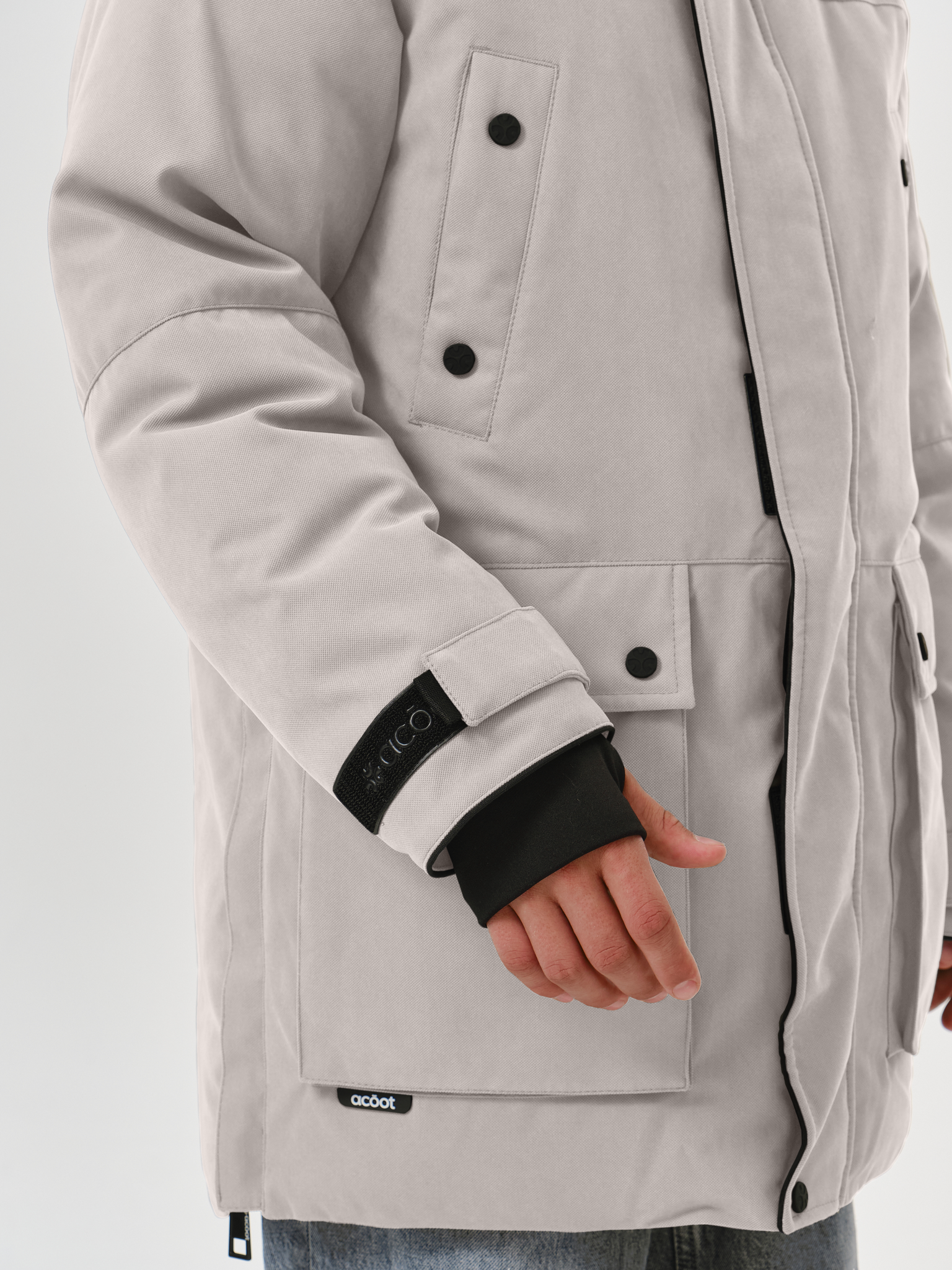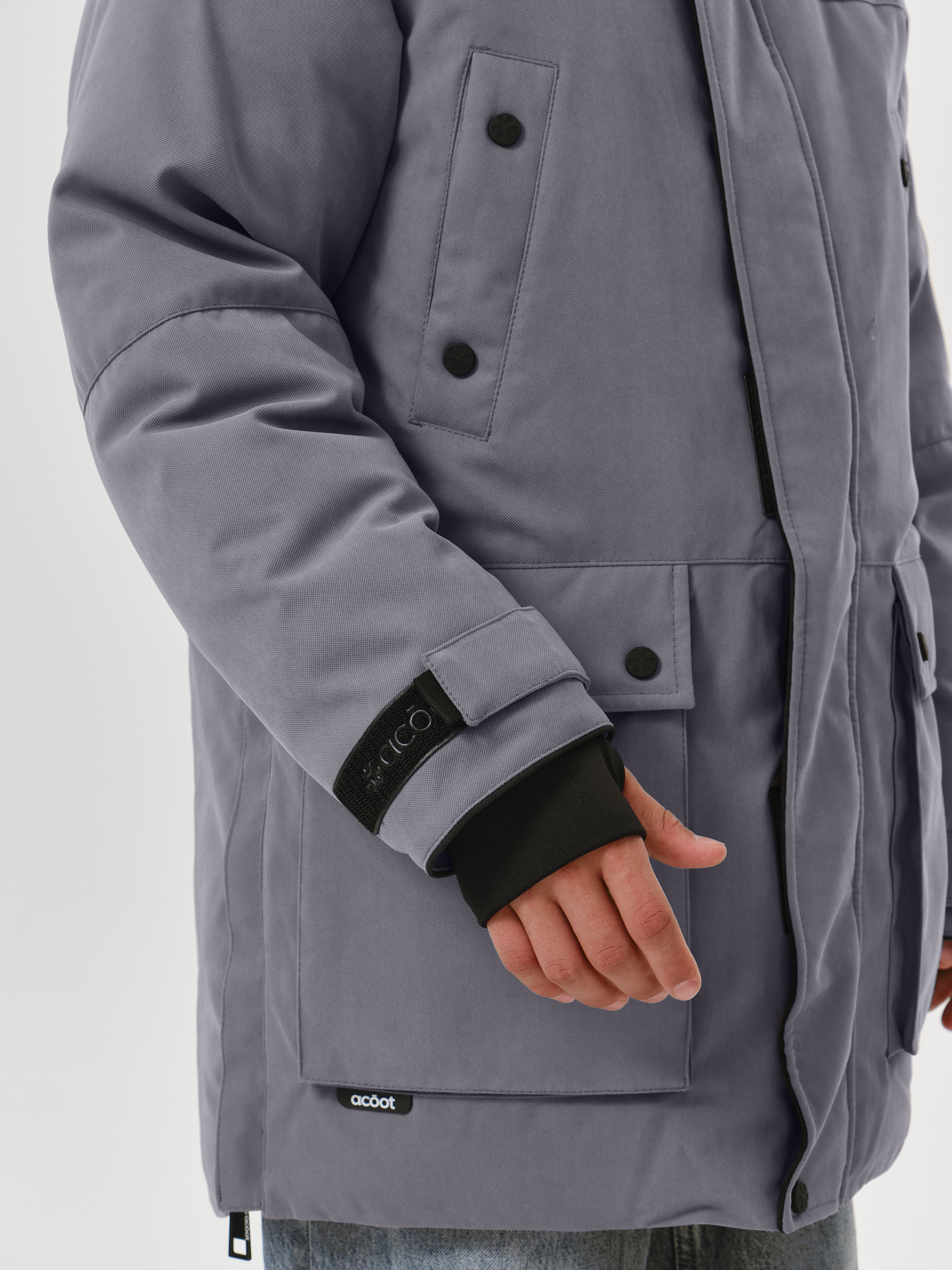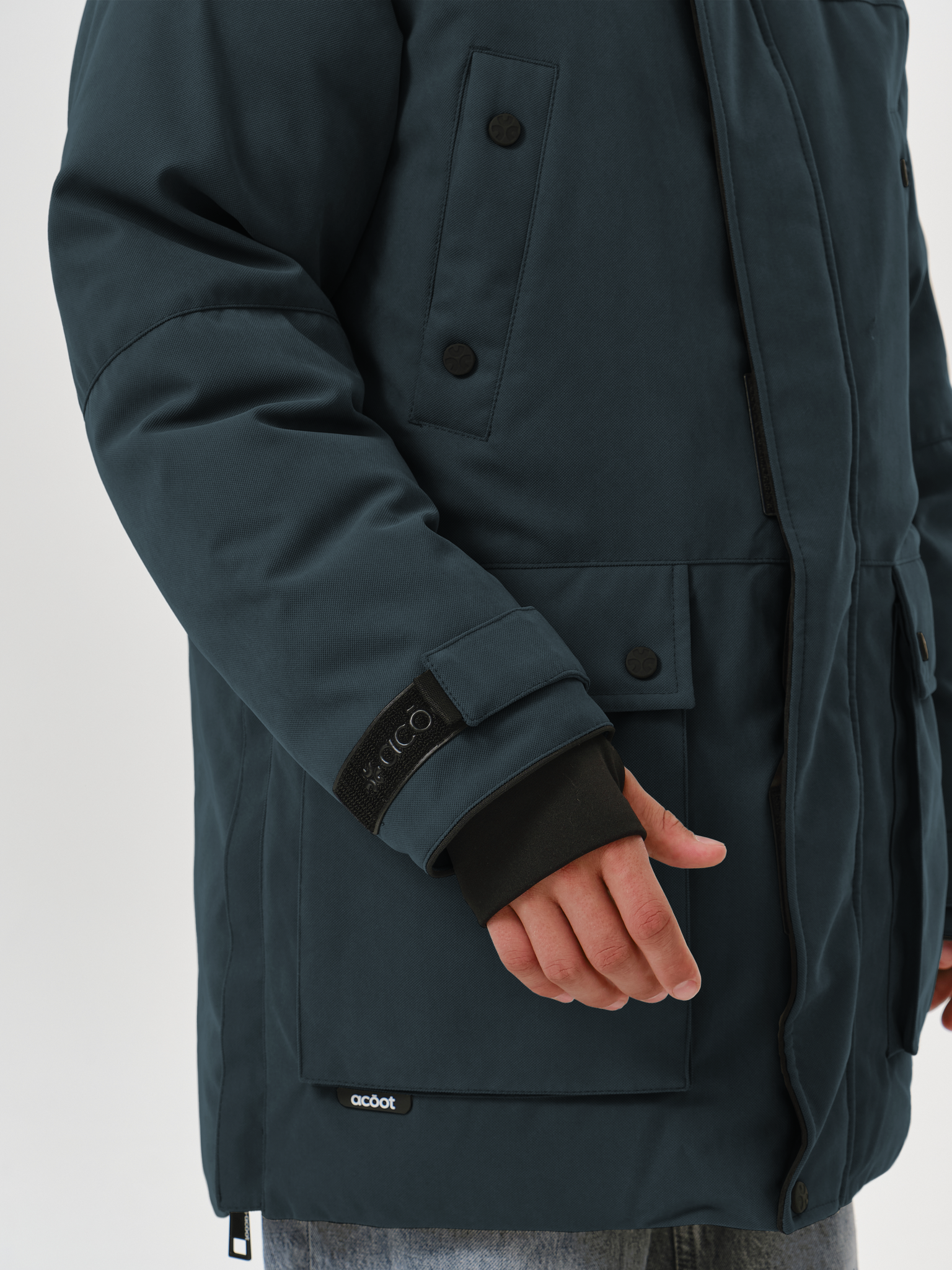 - Два верхних кармана для рук, два вместительных накладных нижних кармана, тёплый карман под планкой на молнии и внутренний карман с молнией на подкладке