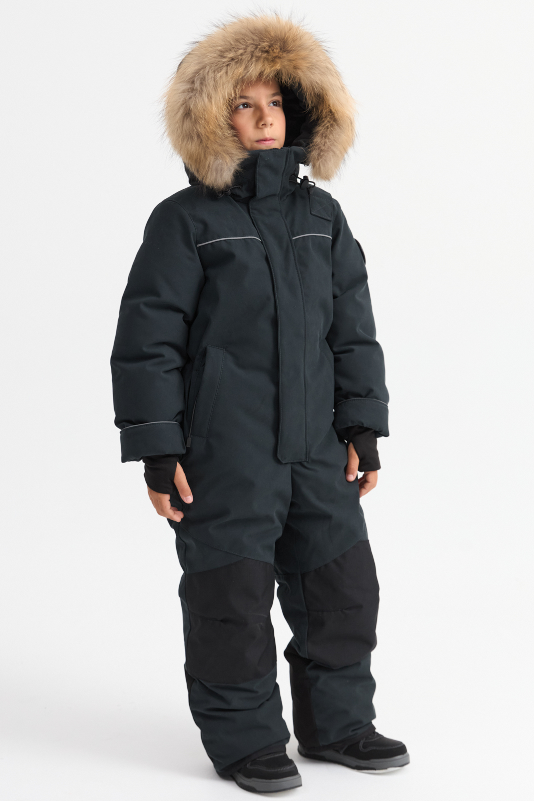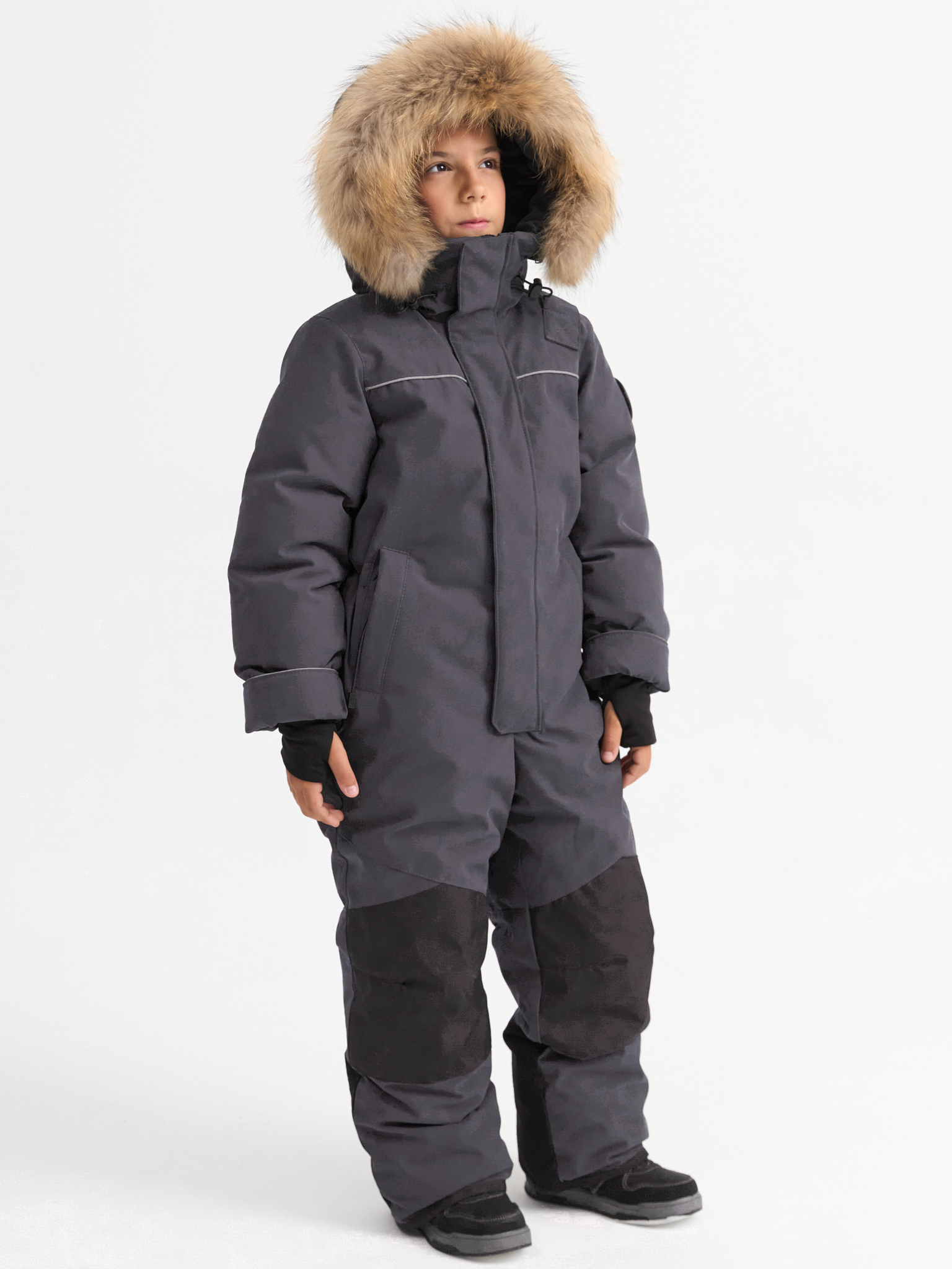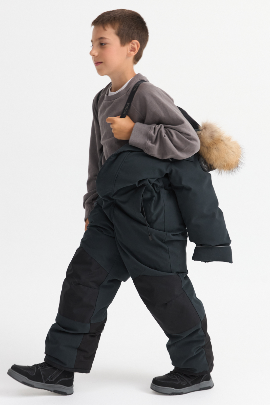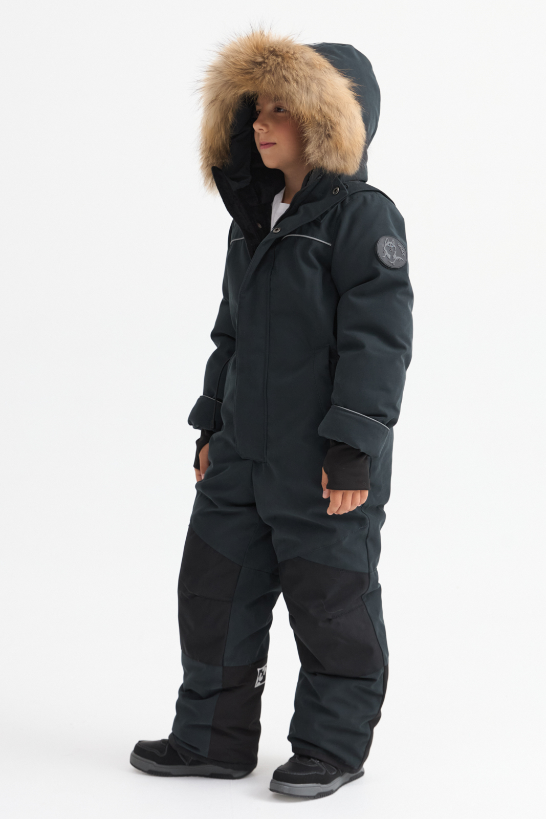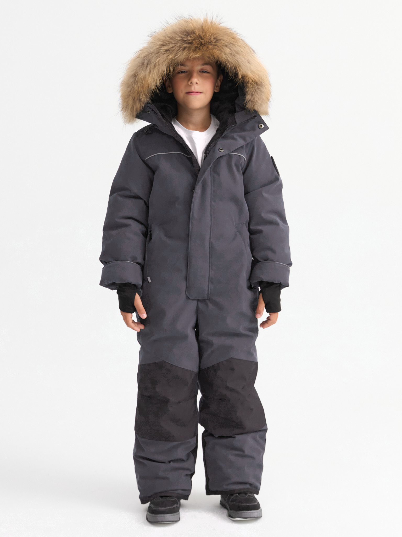 Детский пуховой комбинезон в стиле « Унисекс» для мальчиков и девочек. Модель утеплена пухом водоплавающей птицы, усилена технологичным синтетическим материалом СЛАЙТЕКС® Premium в местах возможного образования «мостика холода». Наколенники и низ брюк выполнены с усилением Cordura® - комбинезон не будет истираться от частых хождений ребенка на коленках.