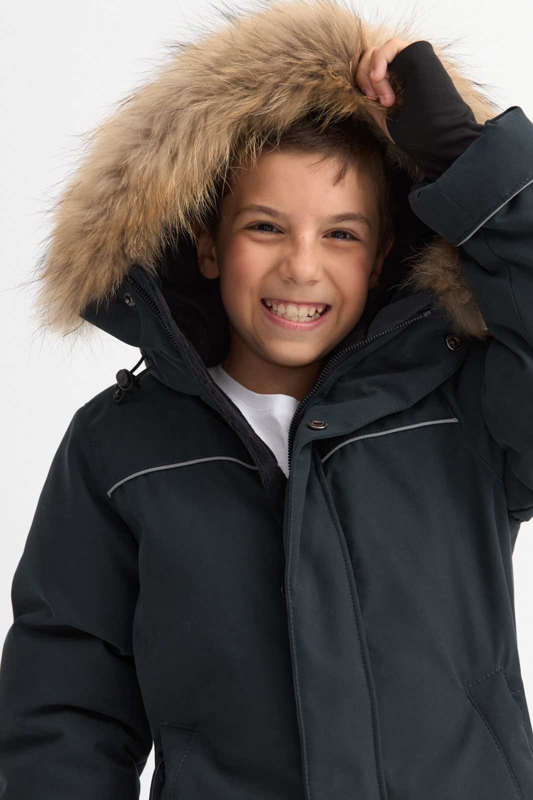 Капюшон оснащен дополнительными кулисками и хлястиками, которые позволяют регулировать его по высоте и ширине для более плотного прилегания. Съёмная опушка из натурального меха создает дополнительную защиту от ветра и холода.