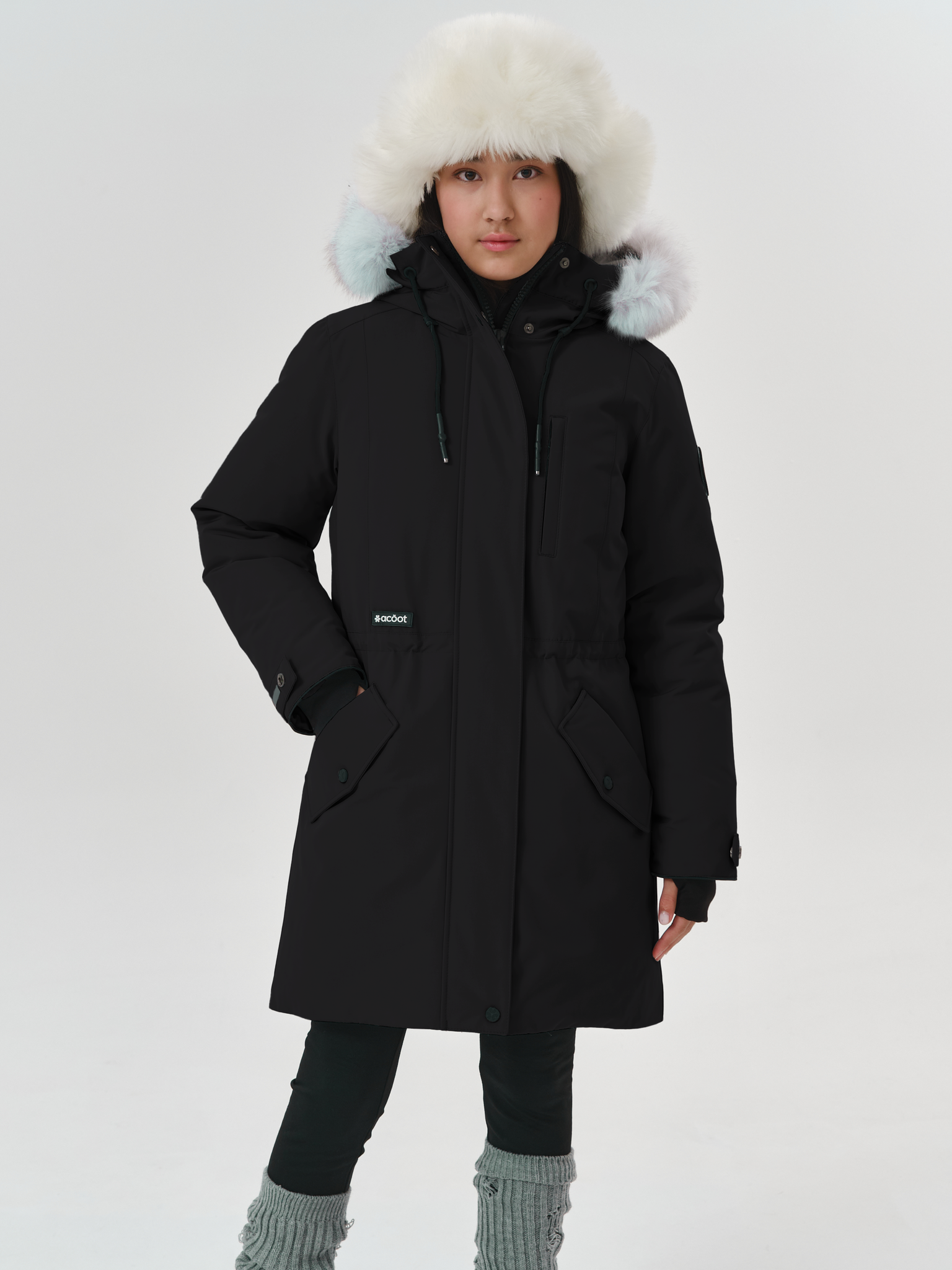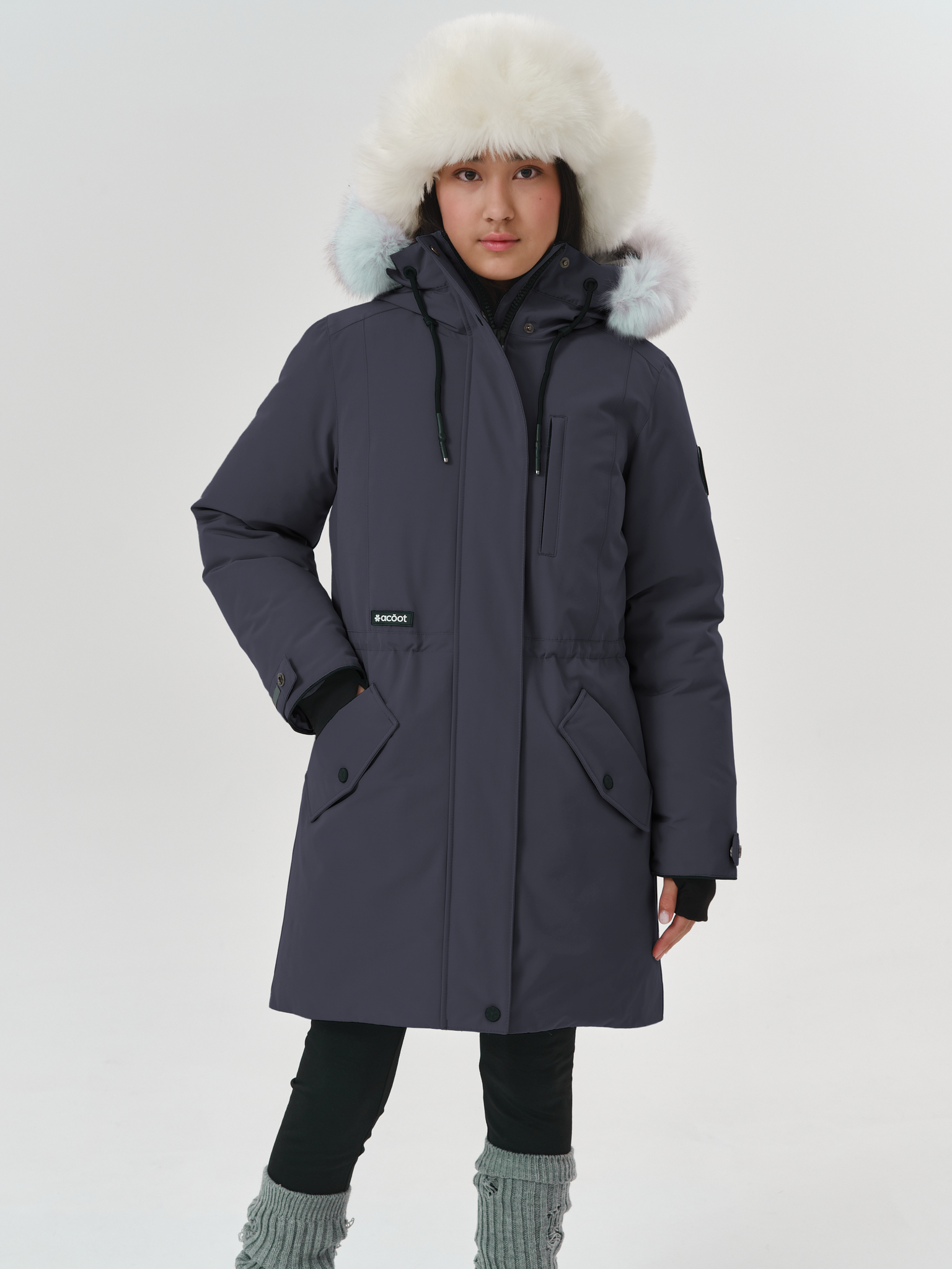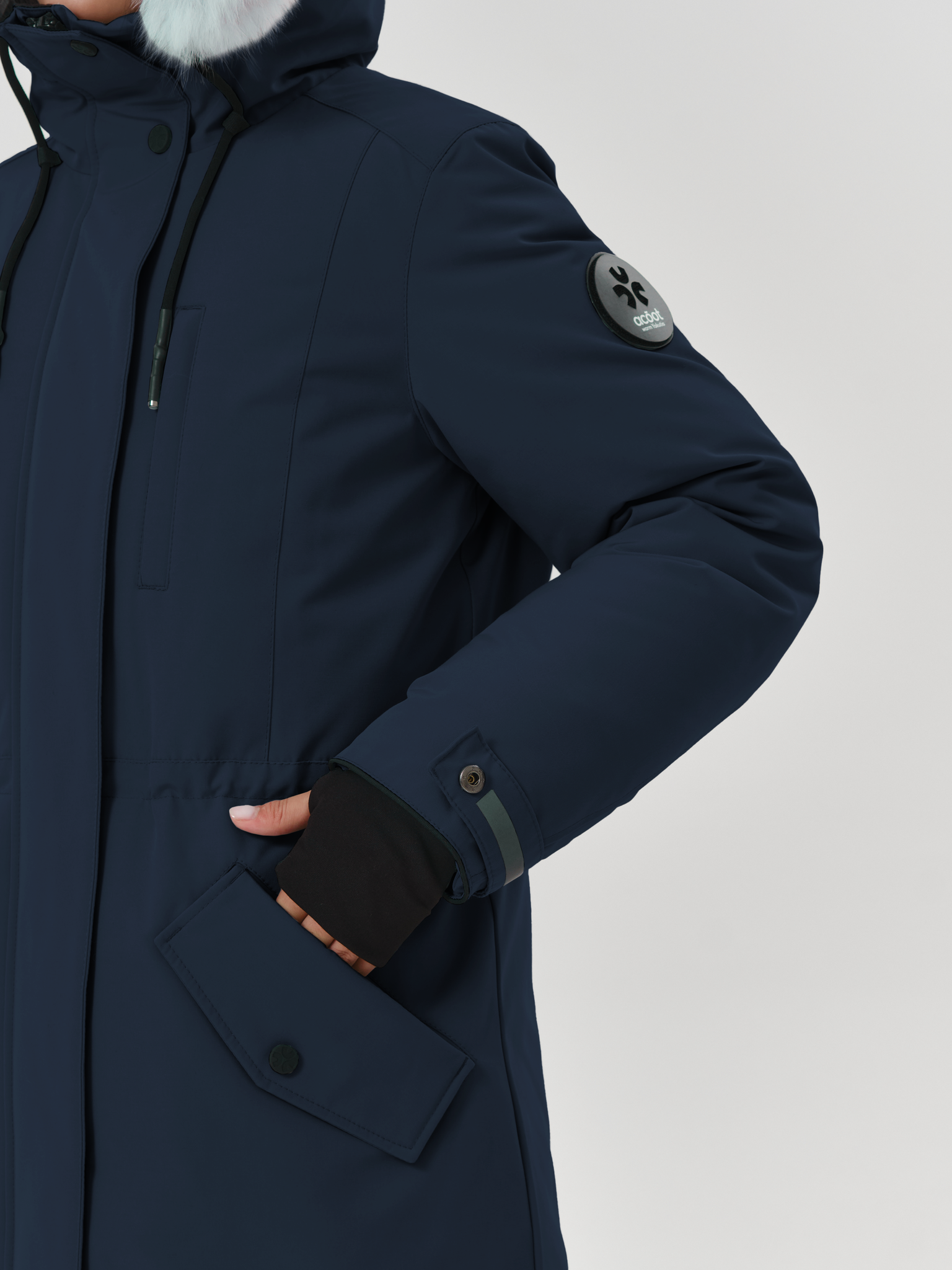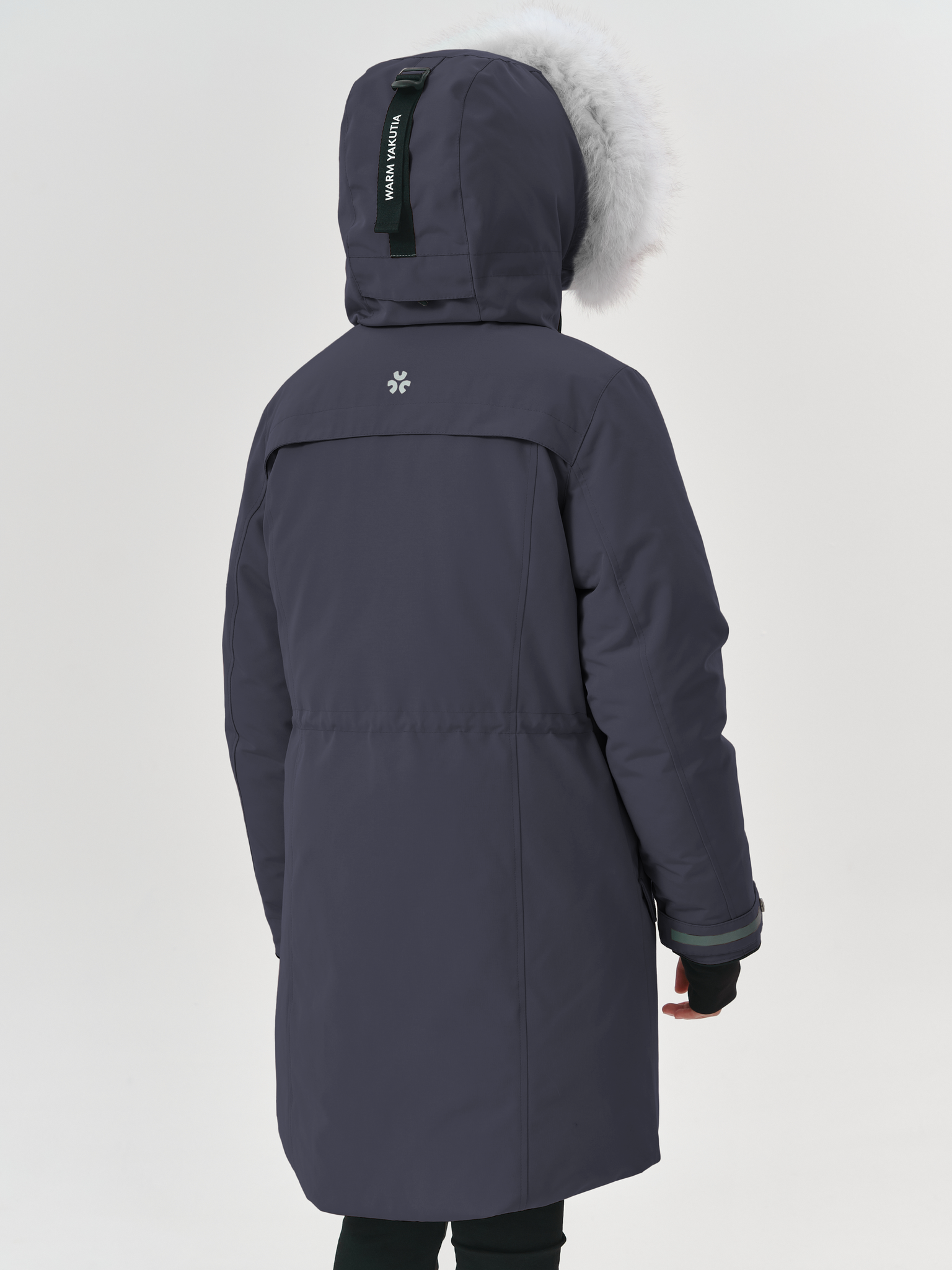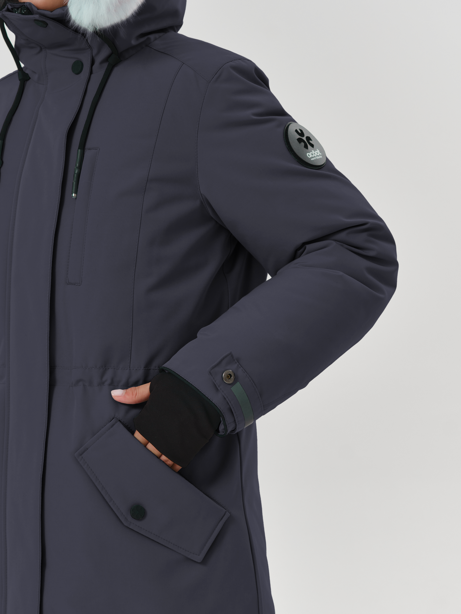 Куртка утеплена пухом водоплавающей птицы, в области плечевого пояса усилена технологичным синтетическим материалом СЛАЙТЕКС® Premium. Вельбоа до талии, плотные манжеты-полуперчатки и кулиска по талии препятствуют проникновению холода внутрь. Удлинённая спинка относительно переда – дизайнерский приём для обеспечения дополнительного комфорта в морозы.