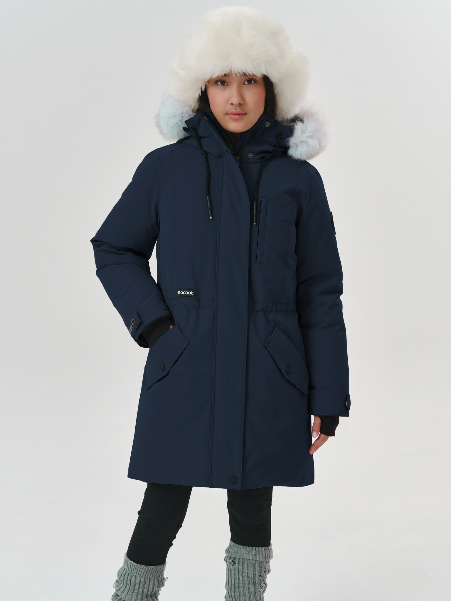 Компактная женская модель имеет очень хорошую посадку на фигуре. Аккуратный плечевой пояс и акцентированная талия создают женственный силуэт. Длина модели эффектно смотрится с утеплёнными брюками.