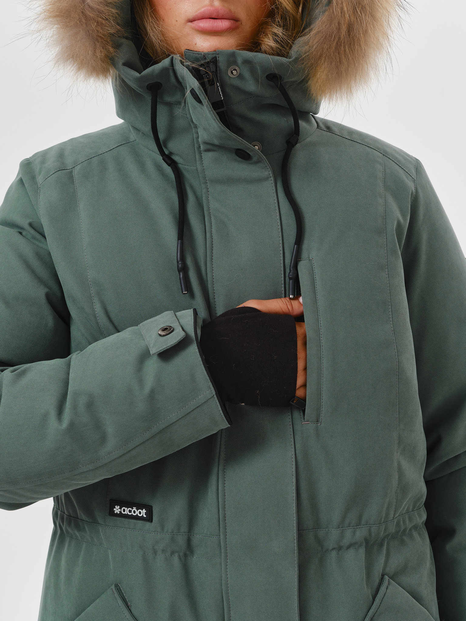 Компактная женская модель имеет очень хорошую посадку на фигуре. Аккуратный плечевой пояс и акцентированная талия создают женственный силуэт. Длина модели эффектно смотрится с утеплёнными брюками. Благодаря мембранной ткани, изделие дышит, не пропуская влагу, ветер и холод до -50℃.
